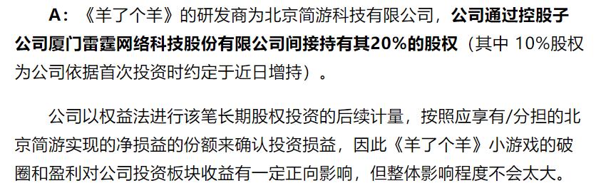 因为吉比特虽然也持股了《 羊了个羊 》背后的北京简游,但是其实也就持股了 20% 。这 20% 里面,还有 10% 是后来追加的。