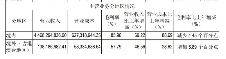 之所以这么说,是因为吉比特的毛利率,能跟茅台掰上几个来回。他们去年的年报里,境内的毛利率达到了惊人的 85.96% 。