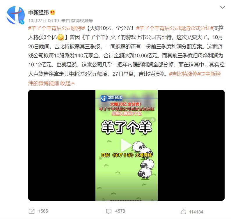 从中新经纬这条微博来看,《羊了个羊 》背后的控股公司吉比特,第三季度净利润就有 10.12 亿,利润分配之后每 10 股能拿到 140 元。吉比特老总一把就分走了 3 亿。