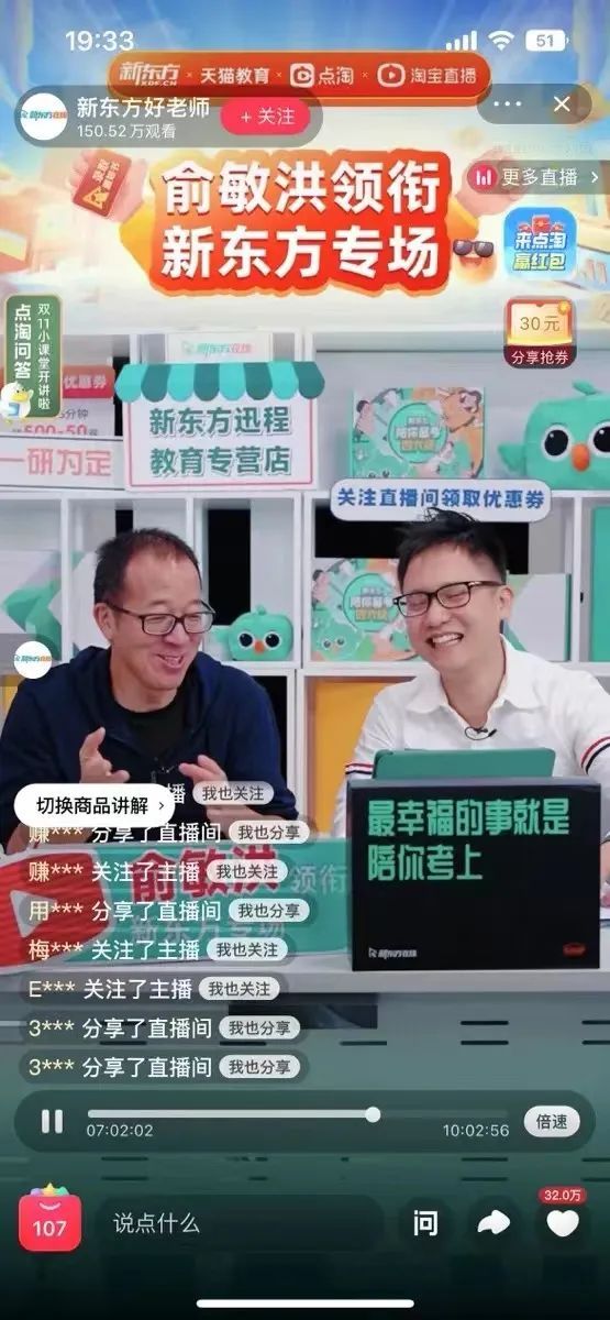 这也并非俞敏洪首次在淘宝直播。去年“双11”期间,俞敏洪就在淘宝开启“直播带课”,分享大学学习、职业路径规划等,不少用户购买了考研英语、大学英语四六级等课程。