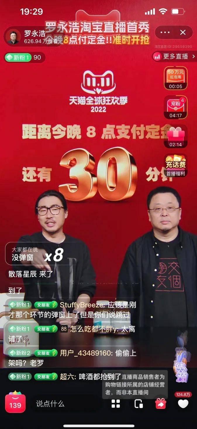 10月31日晚8点,天猫“双11”第一波售卖正式开启。除了“淘宝一哥”李佳琦,淘宝直播间里还多了几张“抖音顶流”的面孔:交个朋友罗永浩、新东方俞敏洪,以及刘畊宏的妻子王婉霏ViVi。