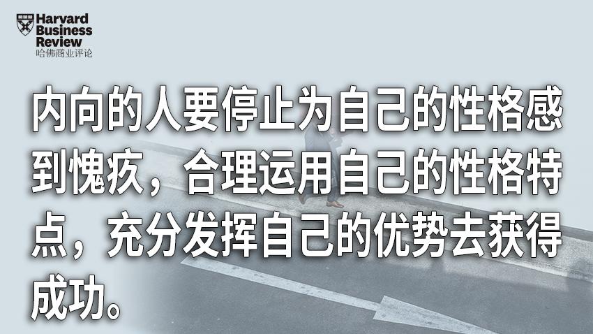 美国职场有一种“内向的人不会合作,不可能成功”的刻板印象。这种印象传递到中国之后,让许多内向的人觉得有压力。一部分企业家的应对方法就是表演,假装是一个外向的人,去参加很多令他们感到不自在的聚会,说很多自己都觉得没有意义的话。但是成年人的性格一旦成形,很难改变和伪装。这就是为什么表演的人最后容易身心疲惫,不能持久。内向的人更现实的选择是:停止为自己的性格感到愧疚,合理运用自己的性格特点,充分发挥自己的优势去获得成功。