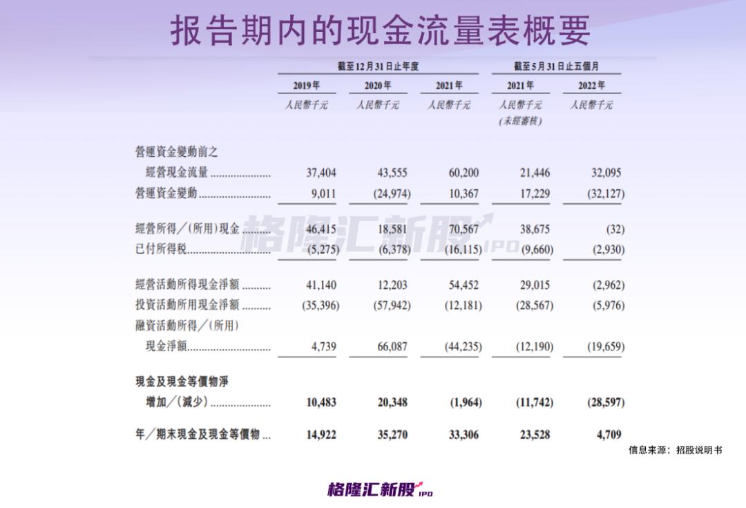 此外,报告期内,乓乓响的经营活动所得现金净额分别为4114万元、1220.3万元、5445.2万元、-296.2万元;截至2019年末、2020年末、2021年末和2022年5月末,乓乓响持有的现金及现金等价物分别为1492.2万元、3527万元、3330.6万元、470.9万元。