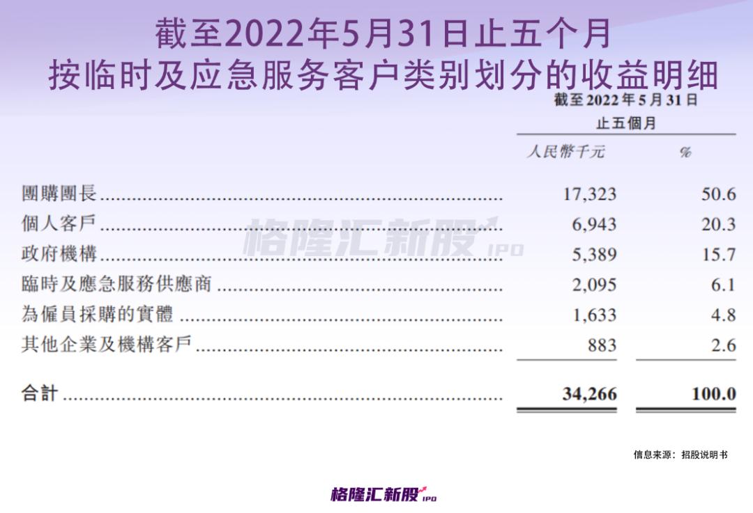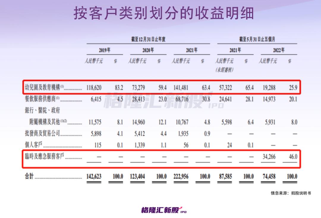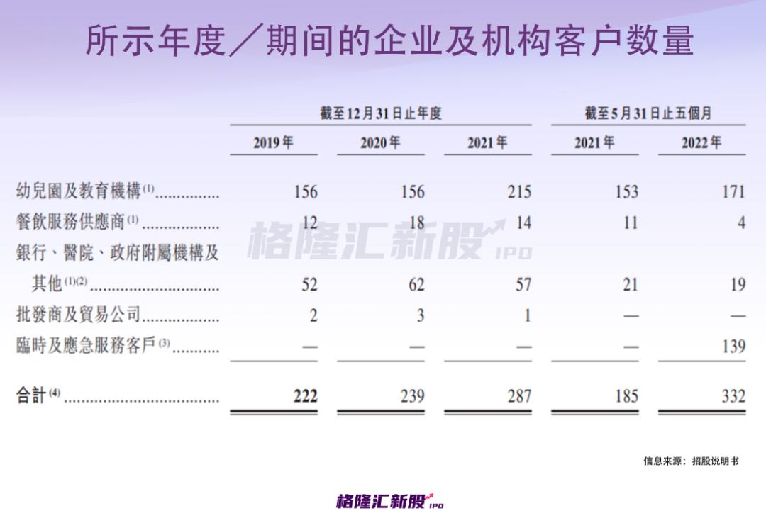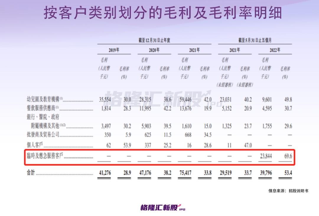 按客户划分来看毛利率,今年前五个月,临时及应急服务客户的毛利率高达近70%,过于吸睛;而幼儿园及教育机构的毛利率排在第二,近50%;餐饮服务供应商及银行、医院和政府附属机构等的毛利率在30%上下。