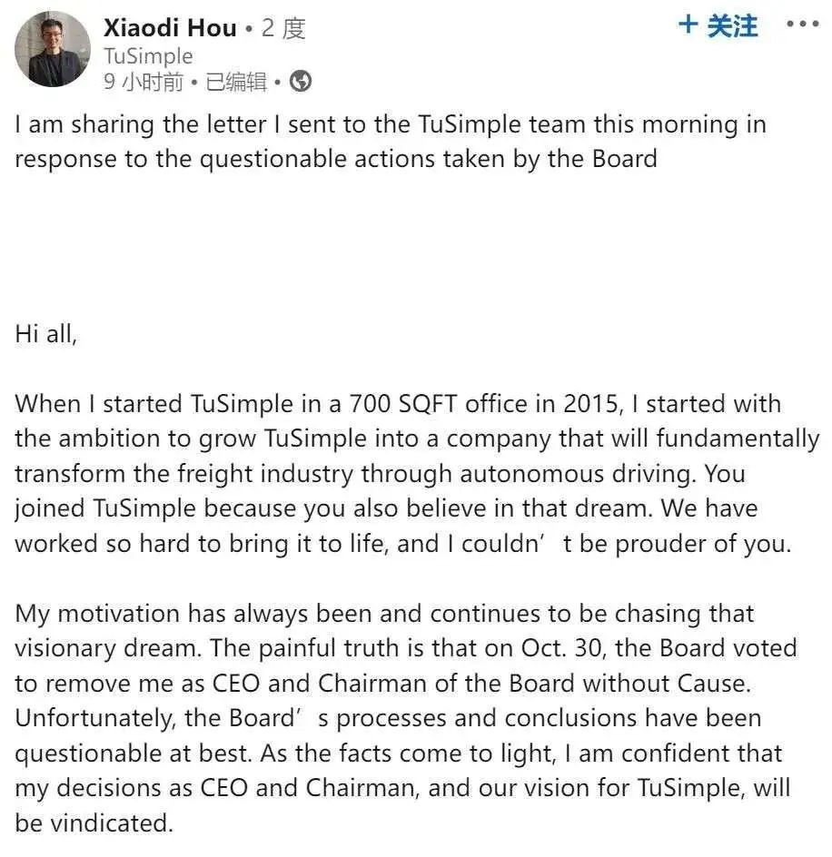 调查结束的代价是,自2018年以来担任图森未来公司总裁、CEO的吕程辞职,由联合创始人、CTO侯晓迪接任。