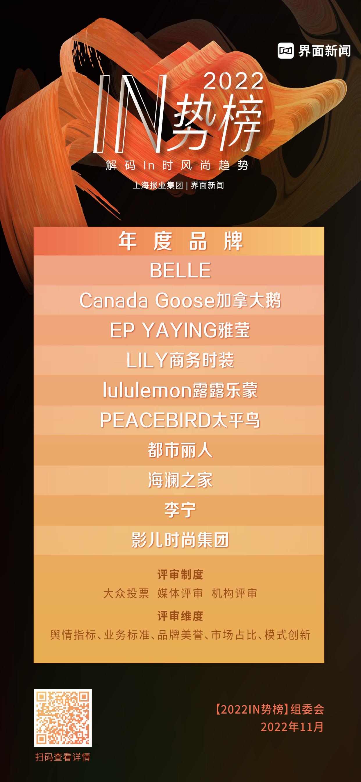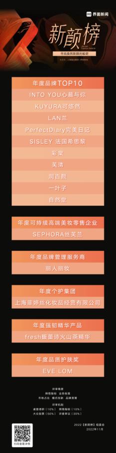 峰会现场还颁发了时尚行业两大年度奖项——新颜榜和IN势榜。两大榜单于今年7月正式启动,经过前期桌面调研、数据分析、大众投票、专家评审等环节,最终角逐出了年度品牌TOP10及单项奖荣誉。