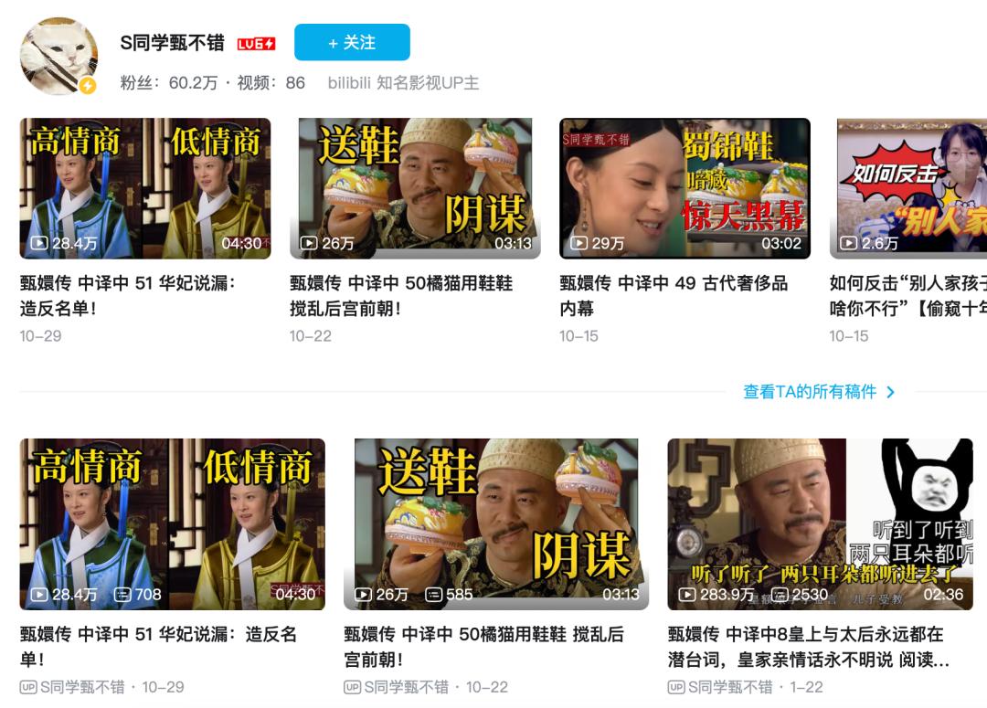 B站UP主“S同学甄不错”今年1月开始更新,凭借独特的“中译中”视角,将剧中一些话里有话、阴阳怪气的情节和对话翻译成通俗犀利的大白话,在一众“甄学家”脱颖而出,10天涨粉15万,目前粉丝已破60万。单凭《甄嬛传》,不到十个月时间就催生出一个播放量3000多万、粉丝60多万的账号,这部剧养活了多少短视频创作者,难以估算。