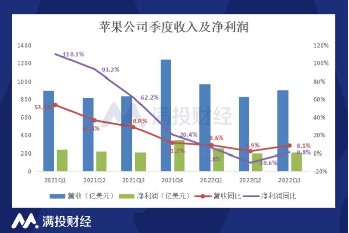 美东时间 10 月 27 日,苹果公司(代码: AAPL ) 公布了截至 9 月 24 日的 2022 财年第四 财季(即 2022 年 Q3 ) 业绩 报告。苹 果三季度实现收入 901.5 亿美元,同比增长 8% ,高于华尔街机构预测的 886 亿美元 ;净利润为 207.2 亿美元,同比微增 1% 。
