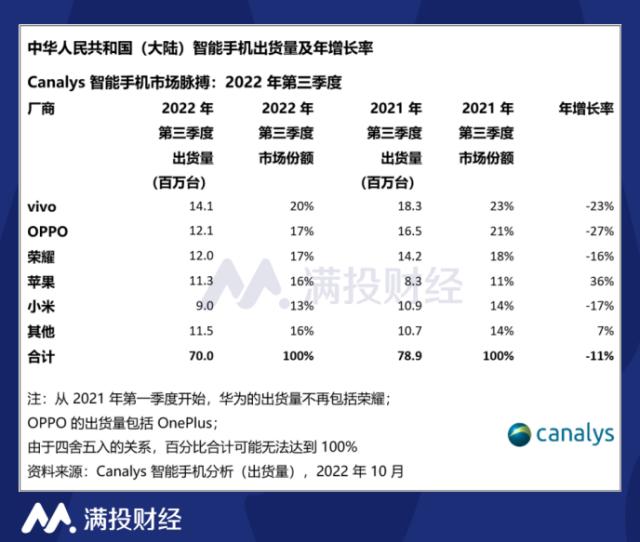 根据Canalys数据,三季度中国大陆智能手机出货量7000万台,较二季度略有改善,但从整体来看,仍处在市场低位,同比下跌11%。