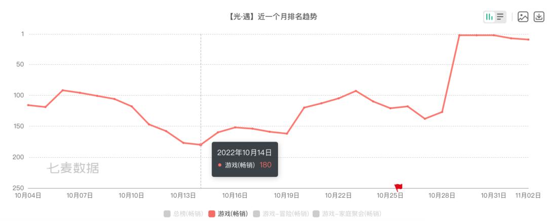 以网易《光·遇》为例。如果按月为单位,近一个月《光·遇》名次浮动差高达177个名次。其实从产品特质我们可以了解到,《光·遇》虽为一款RPG手游,但核心是社交冒险。游戏本身没有太多复杂的玩法构成,甚至可以说是一款侧重探索体验的“小而美”产品。