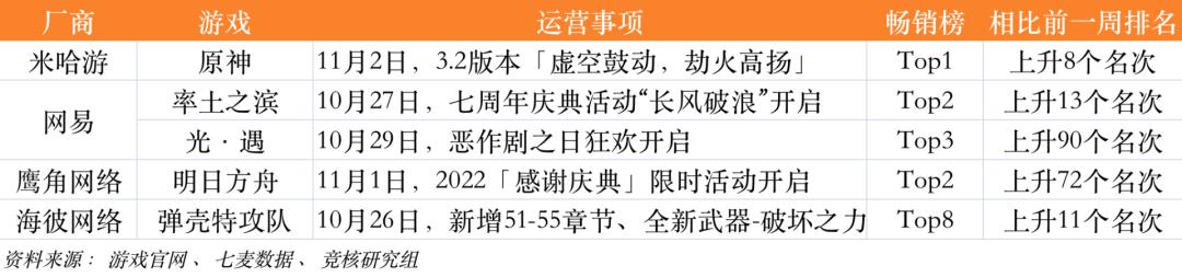 相比之下,米哈游《原神》、鹰角网络《明日方舟》、网易《光·遇》《率土之滨》等排名提升,更多是受益于产品长线运营的“提神增效”。单从App Store游戏畅销榜排名来看,上述产品相比前一周排名上升最少的为8个名次,最多的为90个名次。