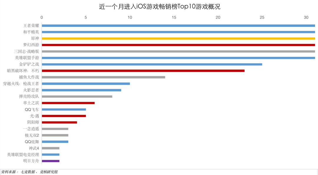 笔者统计近一个月(1003-1102)游戏畅销榜发现,共计22款手游登上Top10榜单。