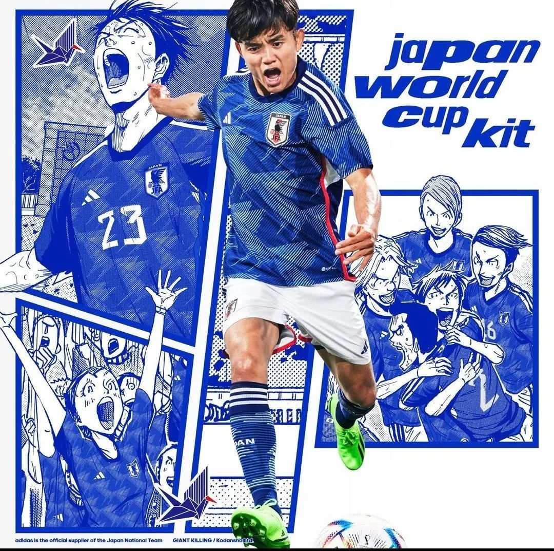 阿迪达斯这一次在不同国家的球衣中都融合进了本土文化细节和符号。比如日本队的主场球衣融合了传统“Origami”纸鹤文化,更有意思的是,新球衣发布还与足球漫画GIANT KILLING(逆转监督)和BLUE LOCK(蓝色禁区)联动拍摄了宣传广告和海报,二次元热血漫画感拉满。最近,阿迪达斯又公布了日本潮流教父、BAPE创始人NIGO设计的日本国家足球队特别系列,它从日本的国花樱花以及传统糖果樱花麻糬中汲取灵感,浅粉色和绿色的极简主义色调颇为清新。