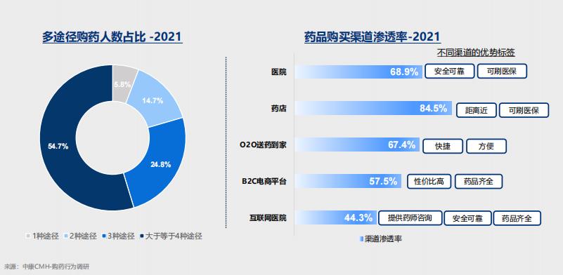 随着“互联网+”在医药行业的进一步渗透,为消费者提供了更多的购药途径。2019年以来,药品市场全国各终端渠道占比趋势持续变化,标内市场占比逐年下降,购药者渠道选择从院内到院外;另一方面,新零售赛道持续扩容,成为零售市场新增长动力,消费者开始从线下到线上转移。中康CMH-购药者行为调研结果显示,有54.7%的受访者会选择4种或以上的购药途径。不同的购药渠道各有优势,多途径购药已成常态。