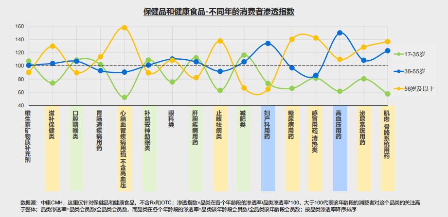 当前,消费者健康产品需求细分愈发精细,药店专业服务需求尚待满足。不同年龄段人群需求差异明显,中康CMH数据显示,年轻人关注亚健康,中老年人则更关注常见病和慢病相关的健康养护。以保健品及健康食品为例,56岁以上人群心脑血管疾病用药(不含高血压)渗透指数最高,36-55岁人群,高血压用药渗透指数最高,17-35岁人群则是减肥类渗透指数最高。