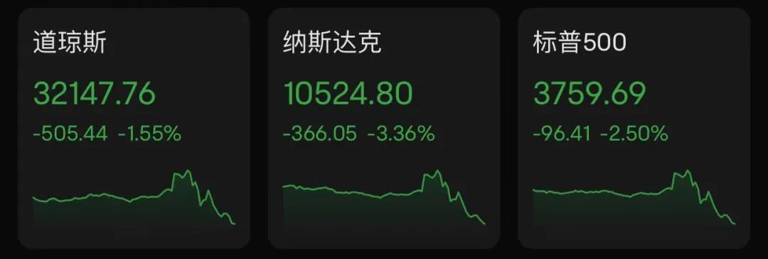 最终,美国三大股指收盘下跌。 道琼斯工业平均指数下跌505.44点,跌幅1.55%,报32147.76点;标准普尔500指数下跌96.410点,跌幅2.51%,报3,759.69点;纳斯达克综合指数下跌366.050点,跌幅3.36%,报10524.80点。