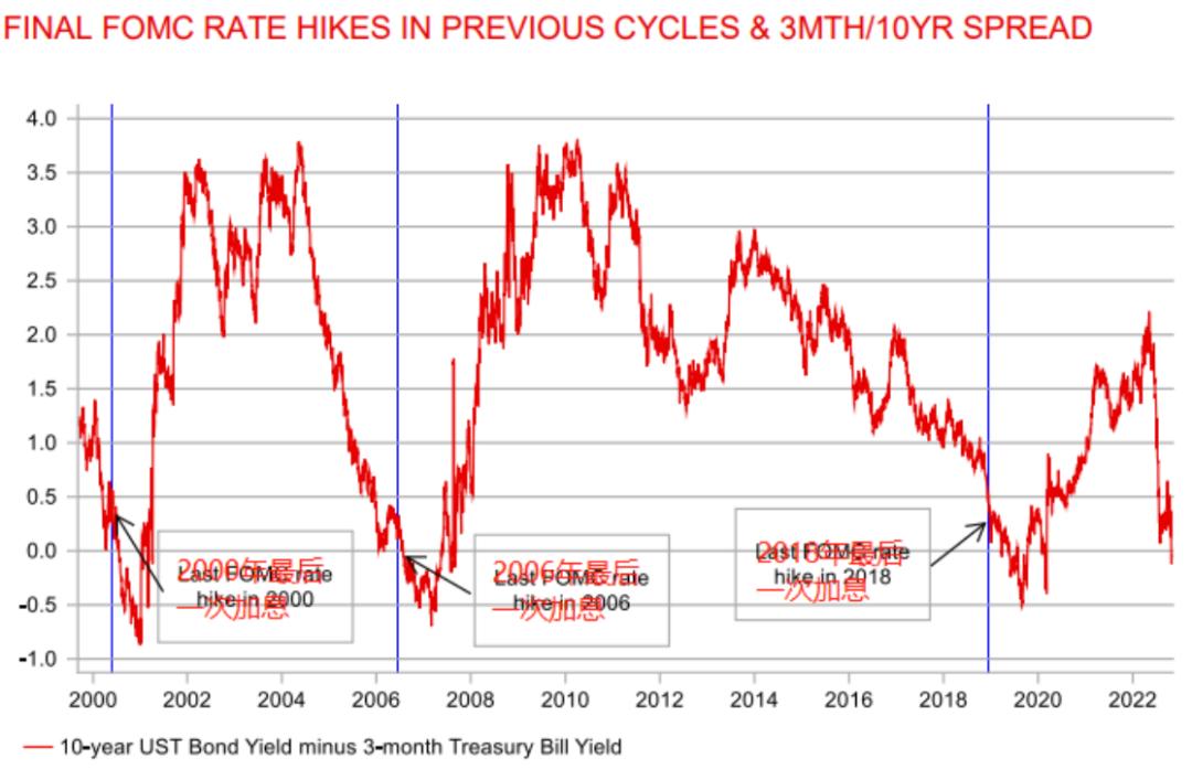 三菱日联金融集团全球市场研究主管Derek Halpenny在发给《每日经济新闻》记者的置评邮件中表示,本周市场对3月期和18个月期美债收益率,以及3月期和10年期美债收益率的“倒挂”程度表现出了明显的关注。Halpenny的团队研究发现,在2000年、2006年和2018年的前三次紧缩周期中,3月期和10年期美债“倒挂”都相关准确地预示了美联储紧缩周期的结束。因此,本周3月期和10年期美债收益率利差再次跌至负值,意味着FOMC的货币政策转向即将发生。