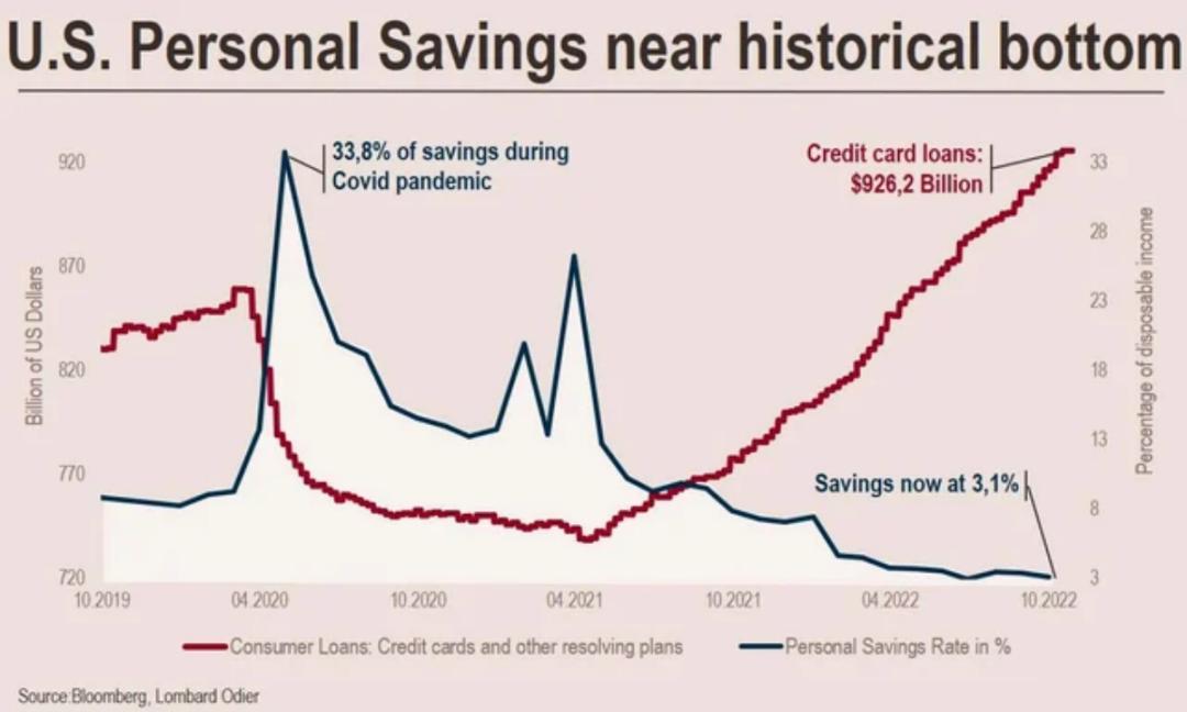 另外,美国商务部上周发布的数据显示,第三季度,美国消费者支出增速从上一季度的2%放缓至1.4%,创近两年新低,消费购买力继续以3%的速度回落。与此同时,据美国经济分析局(BEA)的数据,9月份的个人储蓄率下降至3.1%,创近14年来的新低,且接近历史最低水平。