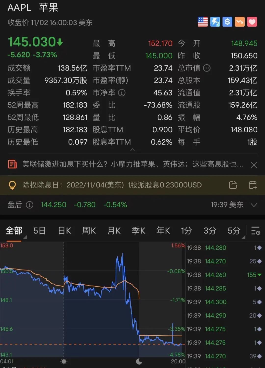 苹果(AAPL)报145.03美元/股,跌幅3.73%,最新市值2.31万亿美元,市值一夜蒸发894亿美元,约合人民币6517.08亿元。