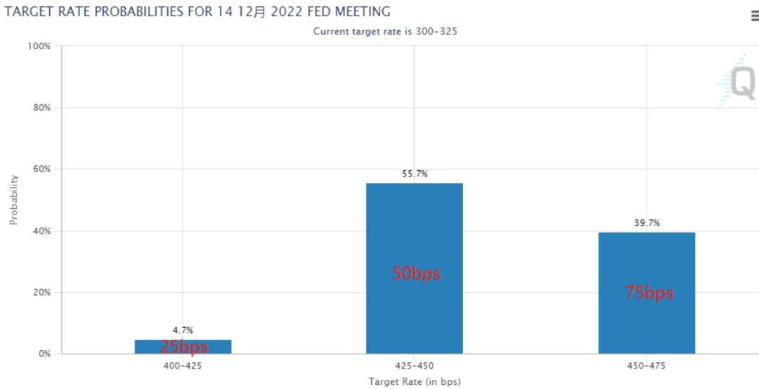 鲍威尔新闻发布会后,联邦基金期货市场对美联储12月加息50个基点的押注出现明显上升,从公布前的不足50%上升至55.7%。相比之下,交易员对12月中旬美联储再次加息75个基点的押注则缩水至39.7%。