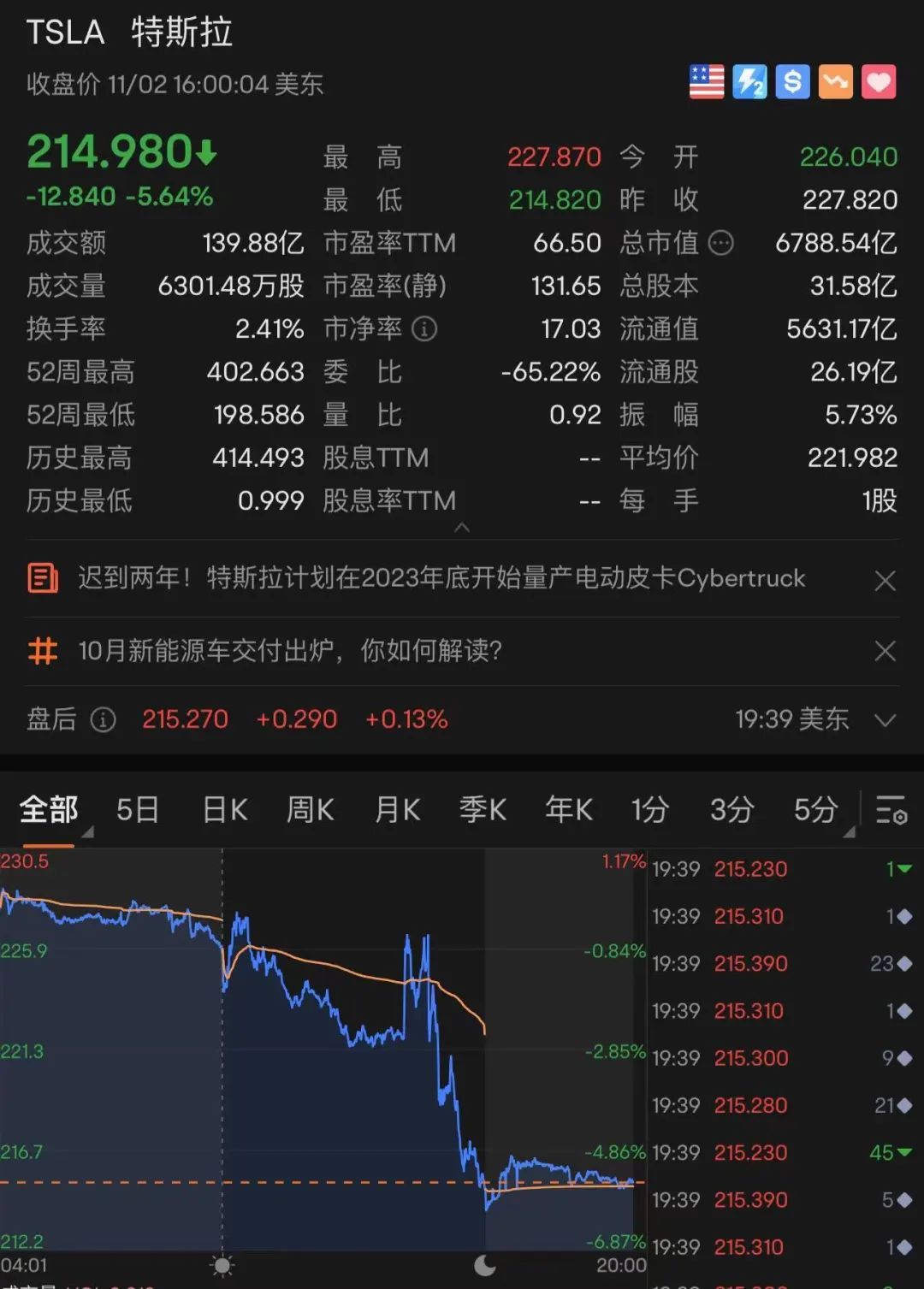 特斯拉(TSLA)报214.98美元/股,跌幅5.64%,最新市值6788.5亿美元,市值一夜蒸发405亿美元(约合人民币2952.37亿元)。
