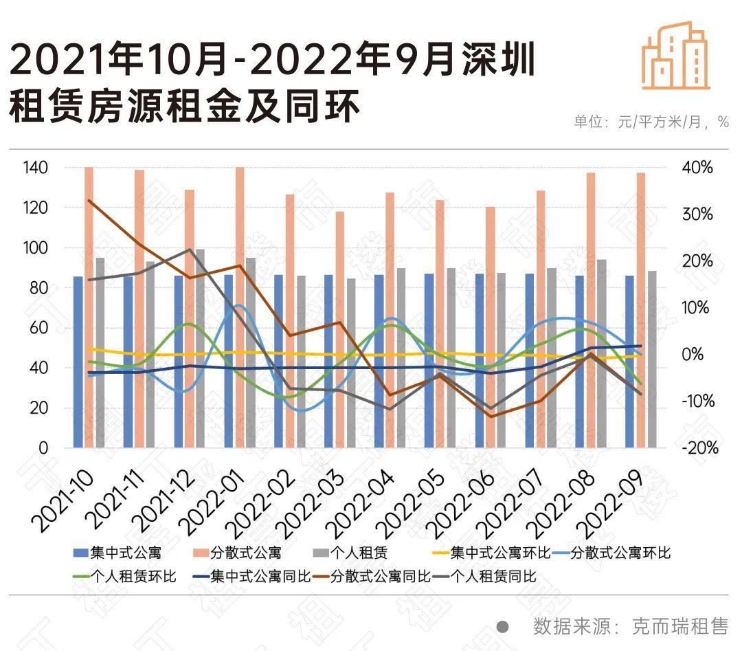 与之相对应的,以商品房为主的深圳个人房源租金9月价格为88.28元/平方米/月,分散式公寓租金为137.28 元/平方米/月;以商务公寓为主的集中式公寓租金为86.01元/平方米/月,由此可见,深圳市2022年度房屋租赁参考价格与目前市场平均价格相比较低。