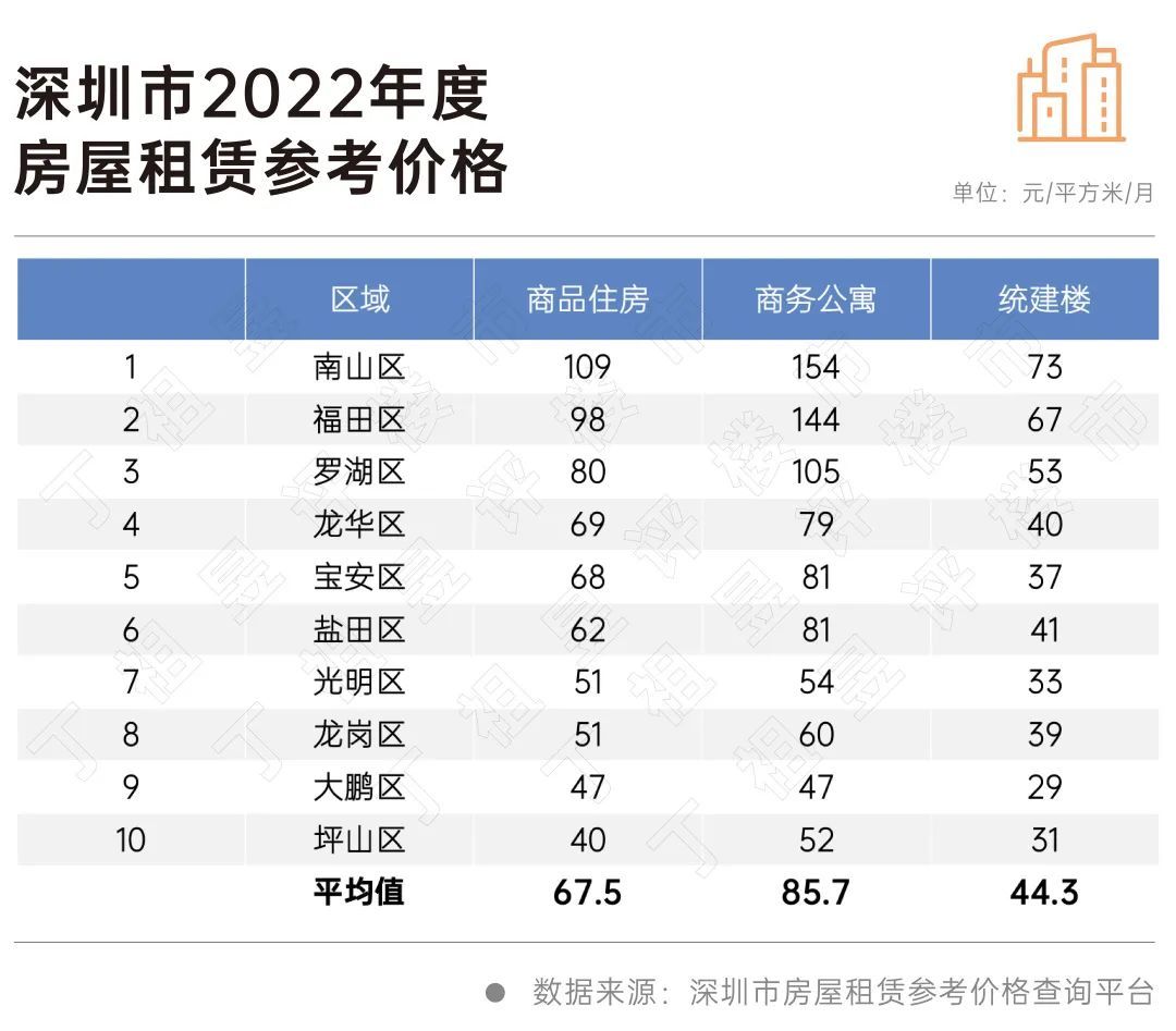 对比此次发布的《深圳市2022年度房屋租赁参考价格》,平均商品住房参考租赁价格67.5元/平方米/月,商务公寓参考租赁价格85.7元/平方米,统建楼参考租赁价格44.3元/平方米。
