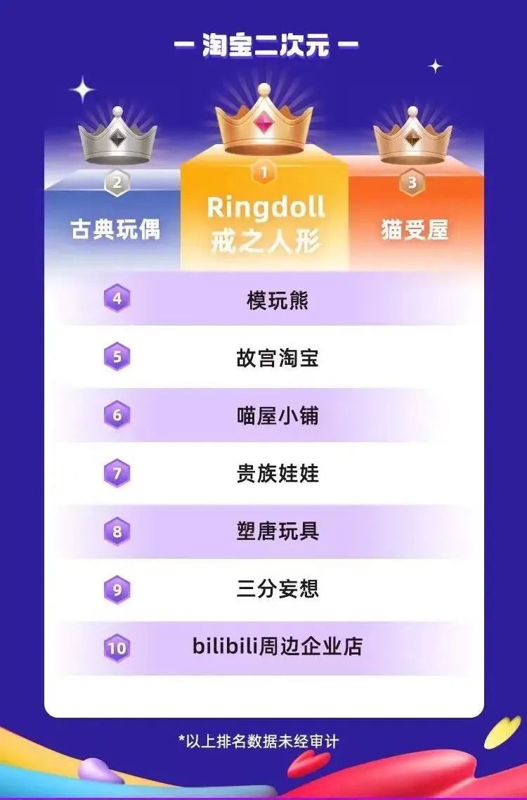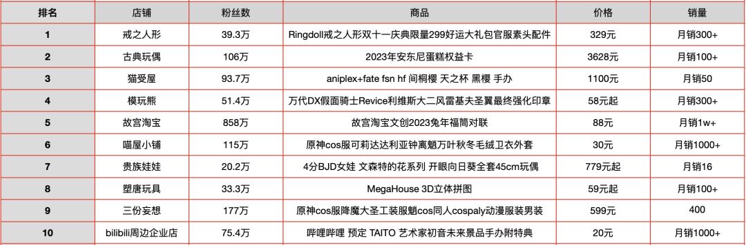 另外,根据淘宝二次元统计的模玩手办及周边店铺销量数据排名,做BJD娃娃相关的戒之人形、贵族娃娃;做lolita相关的古典玩偶、做cosplay服饰相关的喵屋小铺、三分妄想;以及做手办模玩相关的猫受屋、模玩熊、塑唐玩具及bilibili周边企业店都有所上榜。
