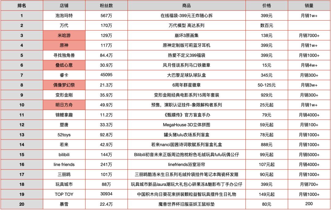 11-20名则集中了包括锦鲤拿趣、52toys、若来、玩具城市、TOP TOY等潮玩品牌及平台。