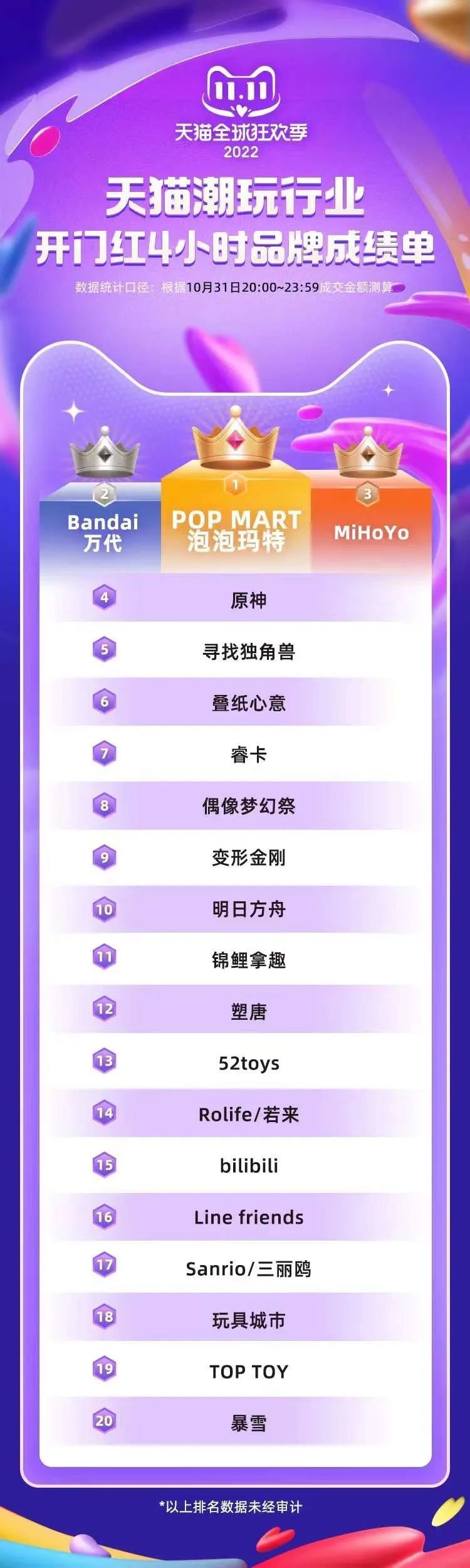 11月1日,天猫发布潮玩行业开门红4小时品牌成绩单,该榜单通过对成交额测算,对天猫潮玩店铺进行了排名,泡泡玛特排名第一,万代排名第二,米哈游排名第三。