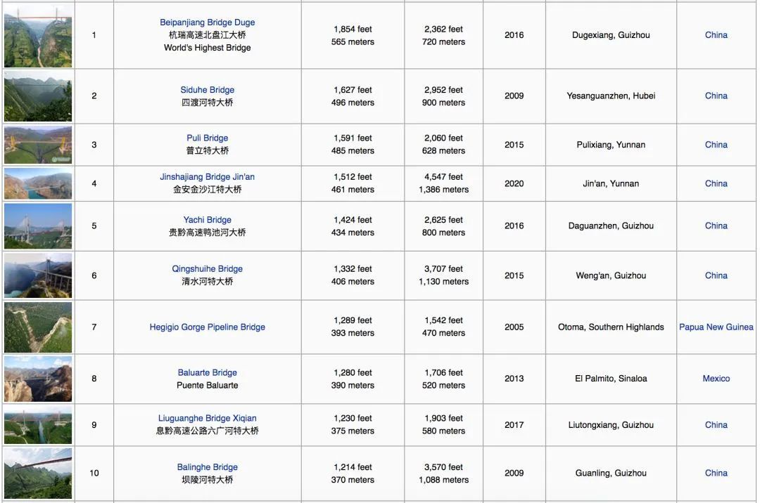 我们往往只关注世界最高的高楼,但其实中国的云南贵州湖北,承包了世界最高的六座大桥。中国桥梁在世界前100最高大桥中占据80%。国外有个收集全世界桥梁成就的网站,直接变成了“中国桥梁大全”。每一座桥都看得人心惊胆战,都成为了奇观。