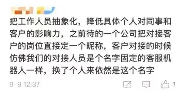 有大厂员工认为:“把工作人员抽象化,降低具体个人对同事和客户的影响力,设置特定岗位的昵称,客户只对接昵称,换个人依旧是这个名字。”