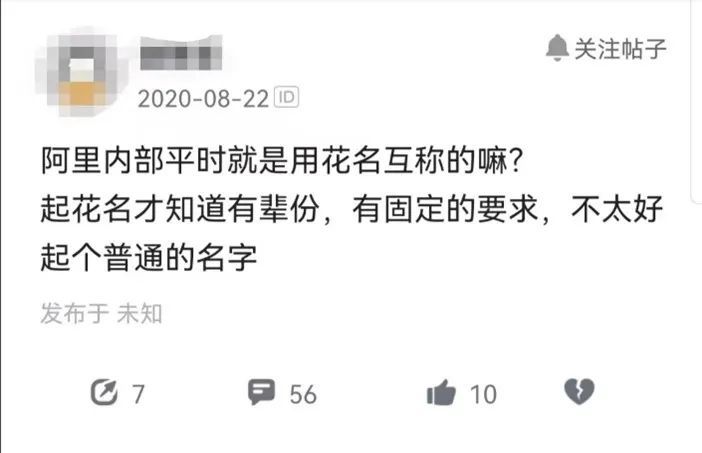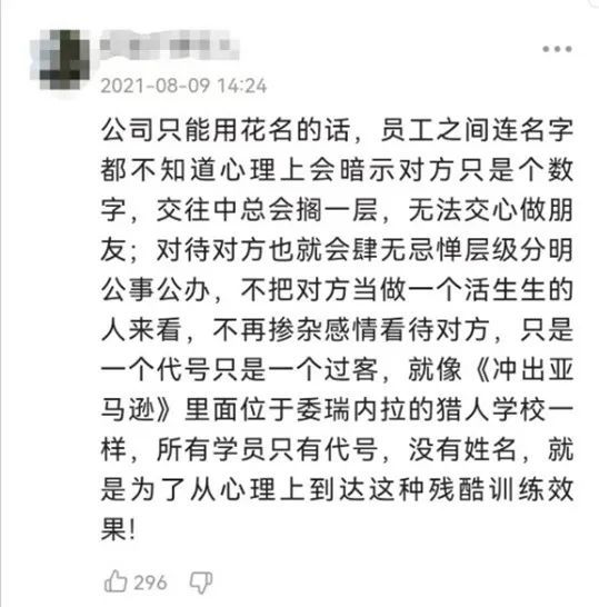 此前,已经有若干媒体秉持这类观点,批评花名制度,这些批评与互联网大厂内部的一些声音相互验证。这些声音抱怨,公司内部只用花名交流,切断原有社会关系,与新组织建立联系,将员工生活与工作完全割裂开。同事之间更加难以了解生活上的信息,最终变成对方生命中的一个过客。