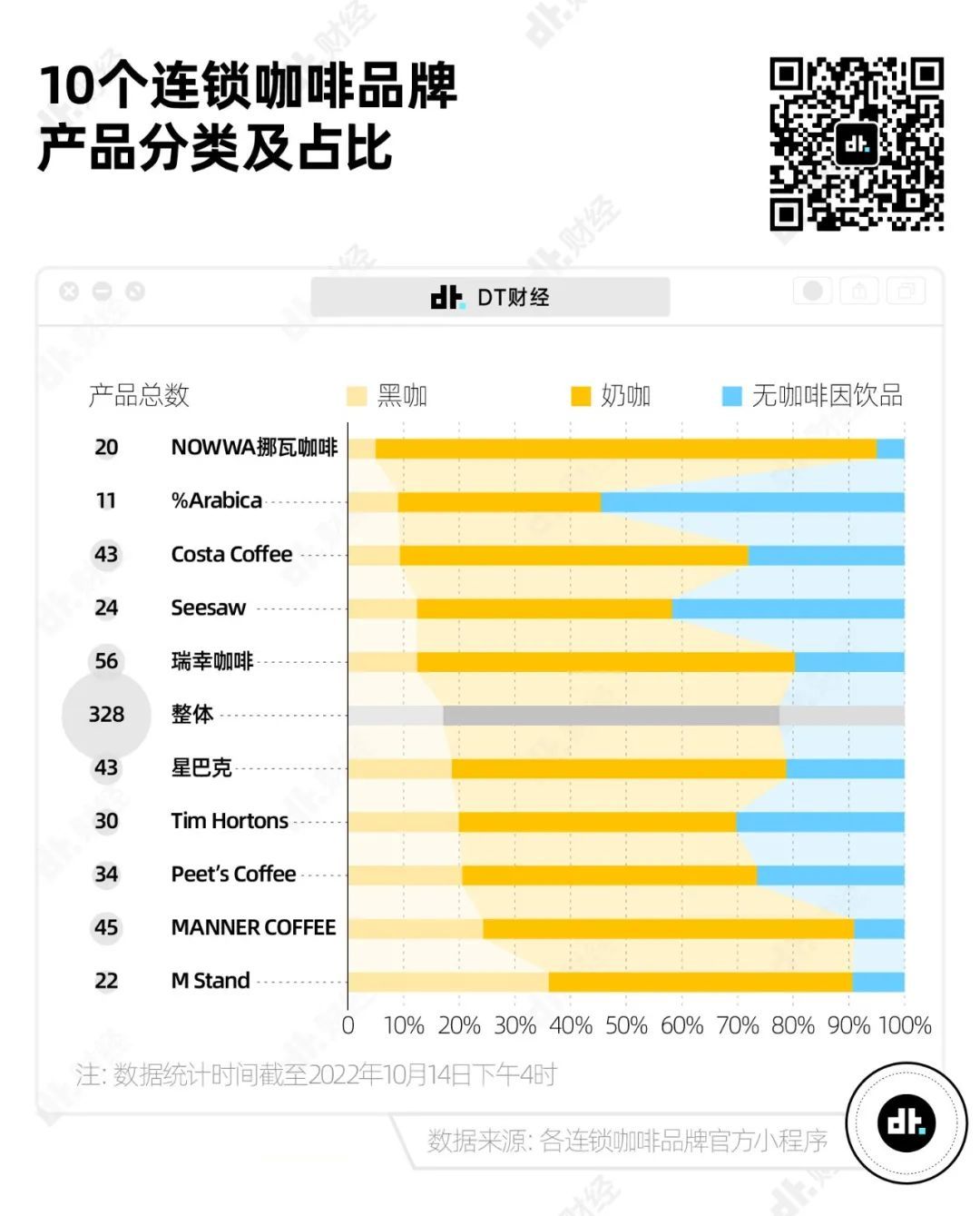 满大街都是拿铁,不是一种错觉。从10个连锁咖啡品牌产品分类来看,奶咖在整体的占比最高。328个单品中,大约6成属于奶咖,接近4成是拿铁,有126款。