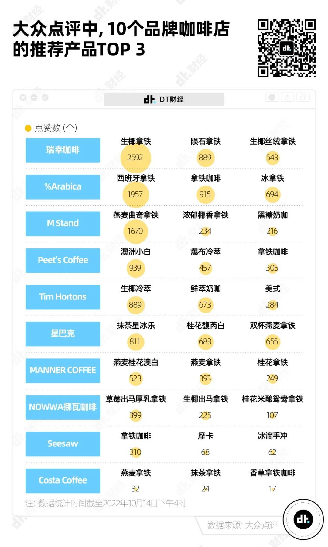从10个连锁咖啡品牌在大众点评上分别被推荐最多的TOP 3饮品来看,拿铁的点赞数是最多的,瑞幸的生椰拿铁以2592个点赞遥遥领先,星巴克推荐最多的抹茶星冰乐,本质是一杯不含咖啡因的抹茶冰沙。