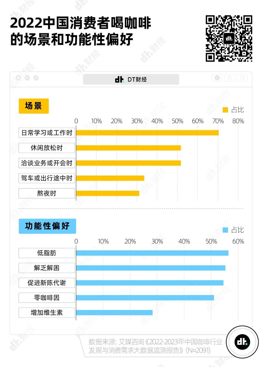 据艾媒咨询《2022-2023年中国咖啡行业发展与消费需求大数据监测报告》,除了日常学习或工作,有51.6%的受访者会在休闲放松时喝咖啡,甚至希望它是一种“0咖啡因”饮料,避免周末晚上睡不着的“咖啡后遗症”。