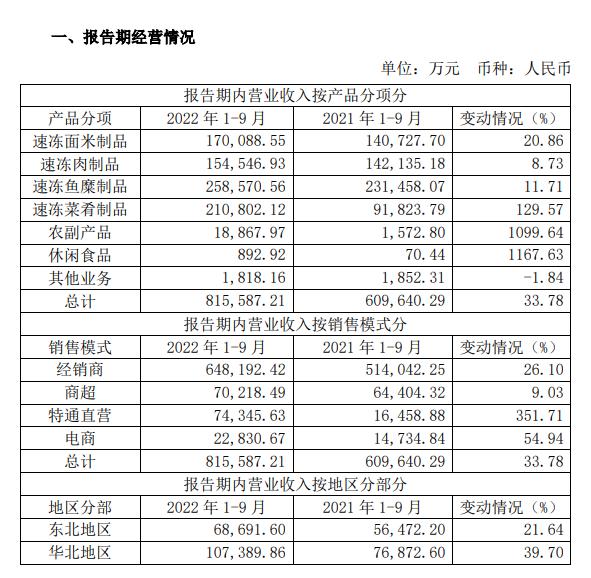 报告显示,2022年前三季度,安井食品实现营收 81.56亿元 ,同比增长 33.78% ;净利润6.89亿元,同比增长 39.62% ;扣非净利润6.04亿元,同比增长58.4%。