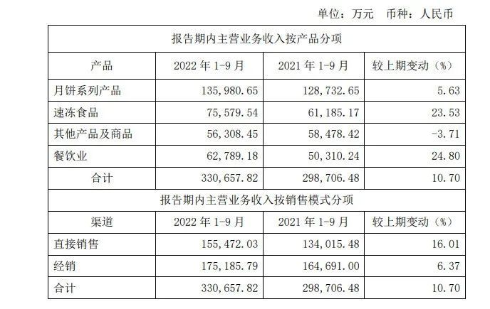 财报数据显示,广州酒家前三季度餐饮业务营业收入为6.28亿元,同比增长24.80%;月饼系列产品营业收入为13.60亿元,同比增长5.63%; 速冻食品营收为7.56亿元,同比增长23.53% 。