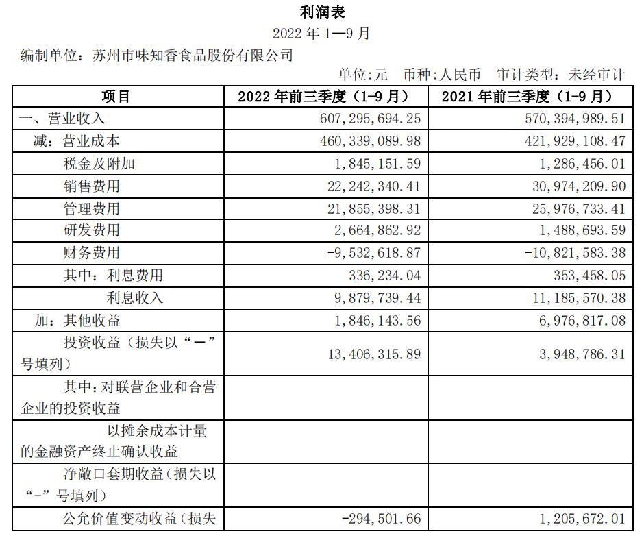 10月27日,味知香发布三季度业绩公告称,2 022年前三季度,味知香实现营业总收入6.07亿元,同比增长6.47% ;归属上市公司股东净利润1.1亿元,同比增长7.65%;基本每股收益为1.1元。