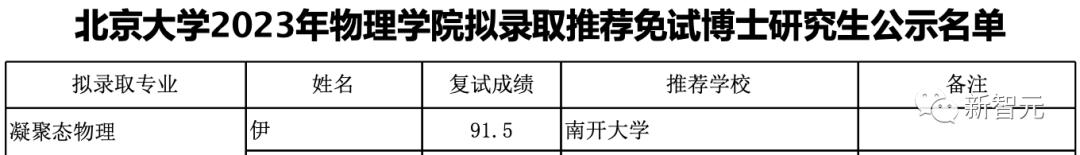 而在北京大学物理学院官网10月6日发布的「北京大学物理学院2023年拟录取推荐免试研究生名单公示」中可以看到,被举报人伊某被拟录取为北京大学2023届物理学院凝聚态物理专业推荐免试博士研究生,复试成绩为91.5分,在拟录取的69名学生中排第31位。