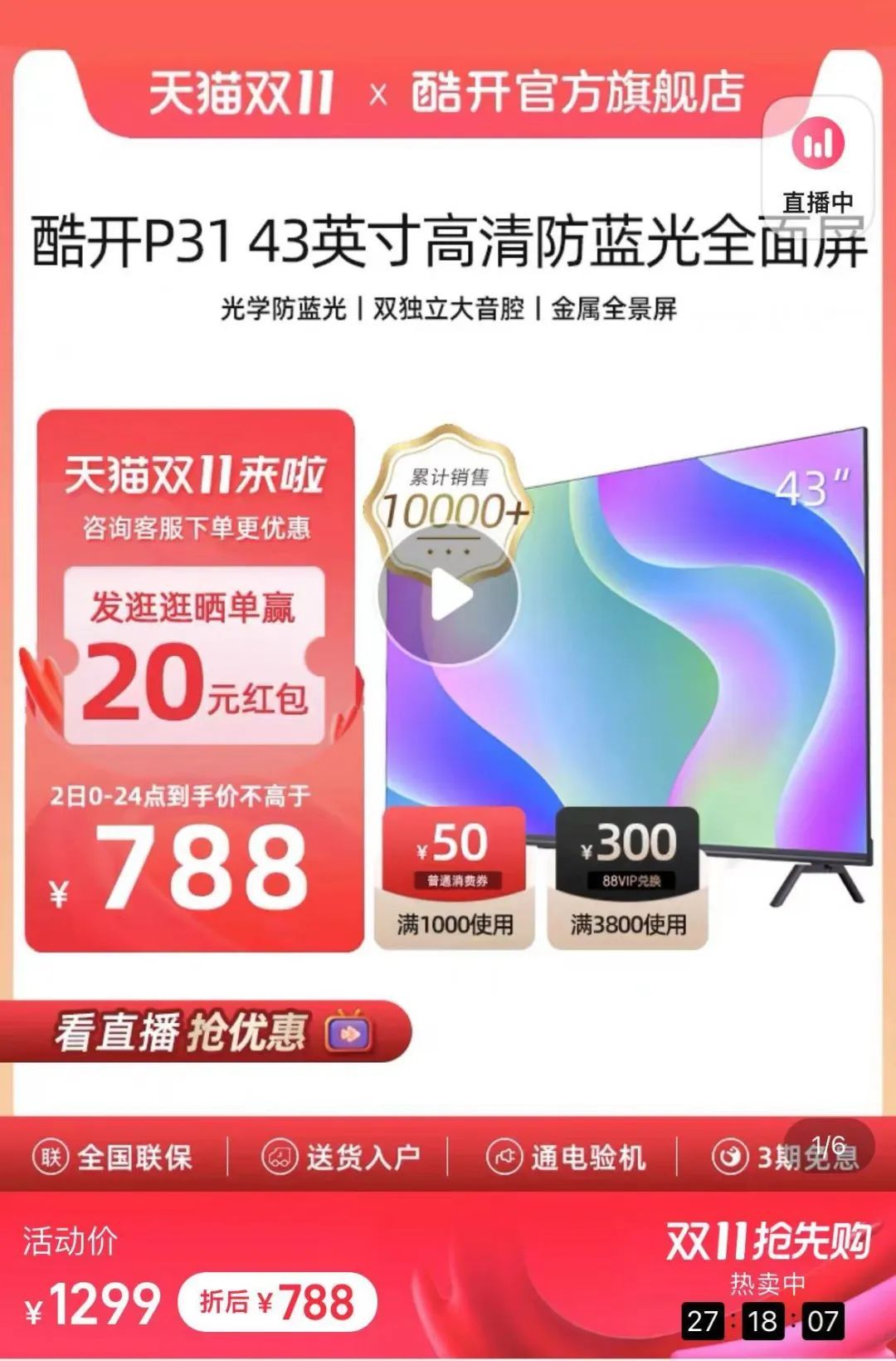 有销售人员透露,今年电视厂家促销力度很大,这几天厂家的“双11”预售活动又已开局,电视价格再创新低,这几天购买电视可以一直保价到“双11”结束。