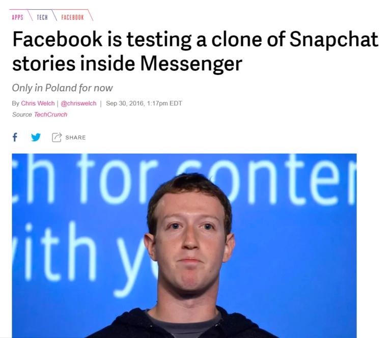 问题是,任何功能一旦行得通并且火起来,就会被别人抄袭。你是可以吹嘘几个月,但他们会赶上来的。Snapchat Stories 刚火起来,Facebook 就抄走了。