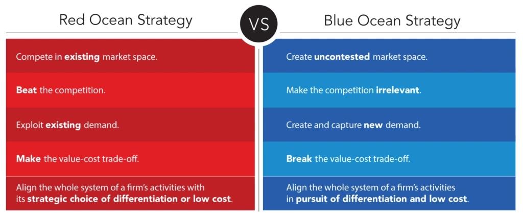 “蓝海”代表新市场——还没有竞争的未开发空间。这是关于创造一个尚未被广大受众发现的市场。随着时间的推移,每一片蓝海都会在成熟时变成红海,吸引着越来越多的竞争者进入。