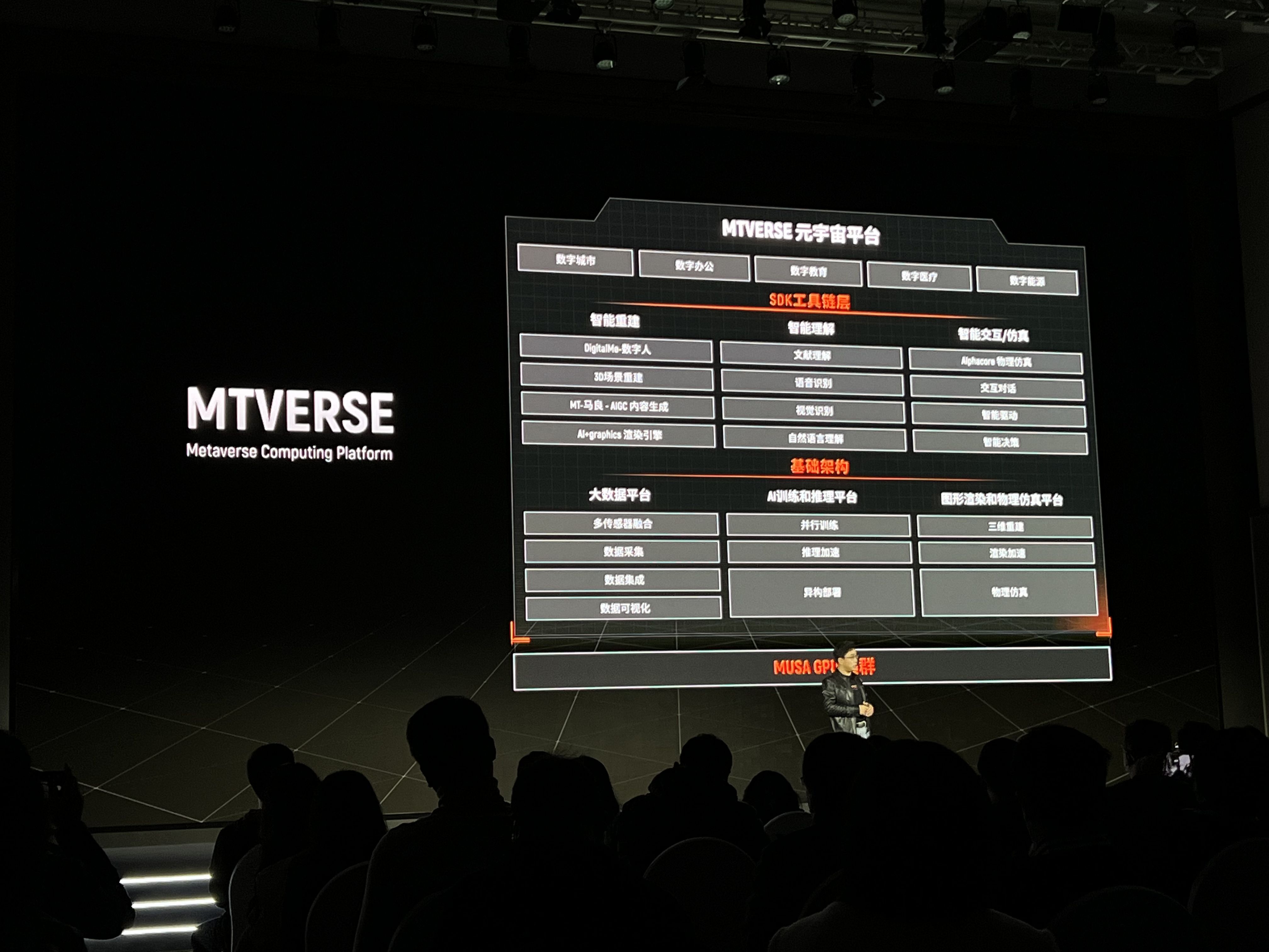 在元宇宙方面,摩尔线程推出专为元宇宙应用构建的MTVERSE元宇宙平台及众多软硬件产品,包括基于MTT S3000打造的MCCX元计算一体机等。简单来看,该平台的基础架构包含大数据、AI训练和推理、图形渲染和物理仿真三大平台,能够为广大开发者提供智能重建、智能理解、智能仿真/交互的SDK工具链,广泛面向数字城市、数字办公、数字教育、数字医疗和数字能源等场景。