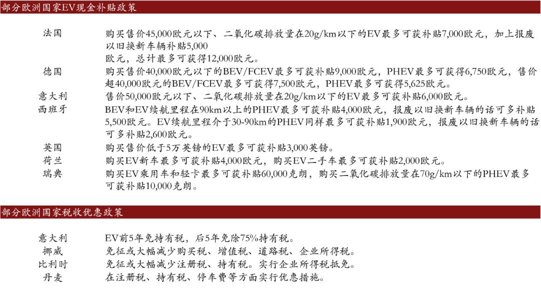 欧盟各成员国也通过现金补贴、税收优惠、金融优惠、出行惩罚/便利鼓励电动汽车销售。例如法国、德国、意大利、西班牙等均推出了现金补贴政策,其中法国最多可以补贴12000欧元;意大利、比利时、挪威、丹麦则推出了税收优惠。