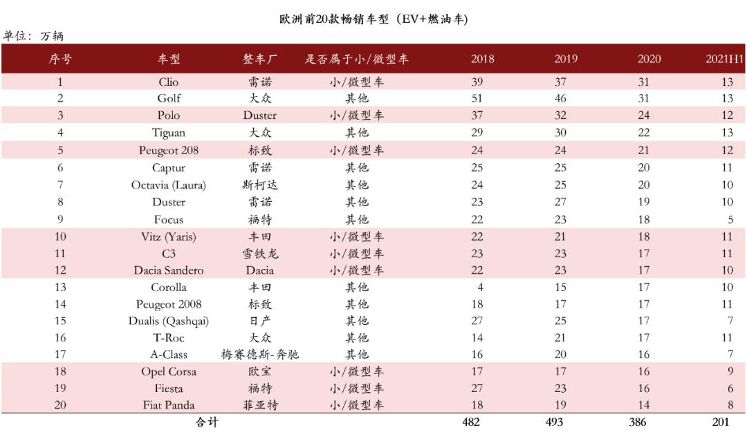 欧洲前20款畅销车型中,近一半是城市出行车(小/微型车),销量占比约46%,年销量约400万台。