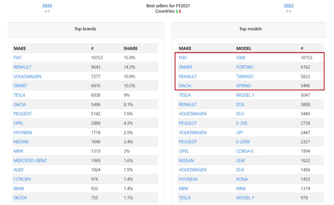 在电动车的时代,这种消费需求和消费习惯仍然得以保留,尤其是环地中海的南欧国家。以意大利的电动车市场为例,小/微型车仍然占绝对主力,销量前四的电动车均是小/微型车。不过从具体车型上看,无论是菲亚特500E,还是Smart Fortwo,都是基于传统造车平台的油改电车型,换汤不换药。