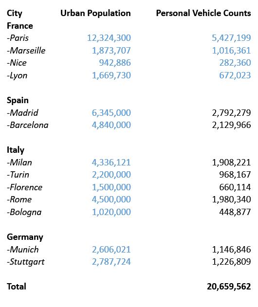 小/微型车是欧洲国家最主流最畅销的车款,欧洲大陆地区的小/微型汽车占总车辆比例接近半数,根据对欧洲最主要的13座城市的大致测算,小/微型车的保有量超过2000万台。