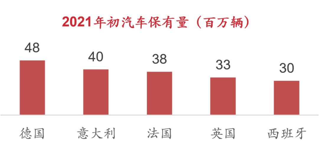 欧洲地区作为汽车市场容量巨大,并且城市化率极高,达到75%,平均每千人汽车保有量为569辆,按照2020年欧洲总人口4.47亿推算,车辆保有量约2.5亿左右。在欧洲经济最发达、人口最多的五个国家,2021年初汽车保有量接近2亿,汽车市场相对集中。