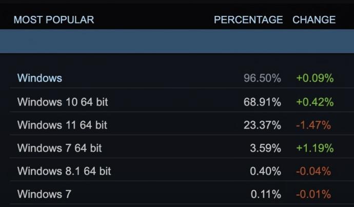 Valve 为其 Steam 游戏平台提供的最新统计数据同样证实了 Windows 11 不及预期这一观点,这些数据可以侧面反映操作系统在 Steam 上份额增减的情况。